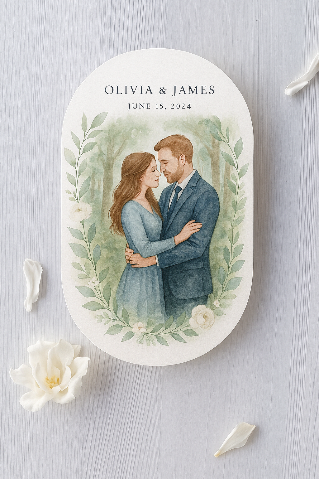 “Abbraccio nel Bosco” è una composizione ad acquerello realistico, realizzata con tratti morbidi e colori naturali nei toni del verde salvia e del blu polvere, perfetta per chi desidera un invito dallo stile elegante ma autentico.