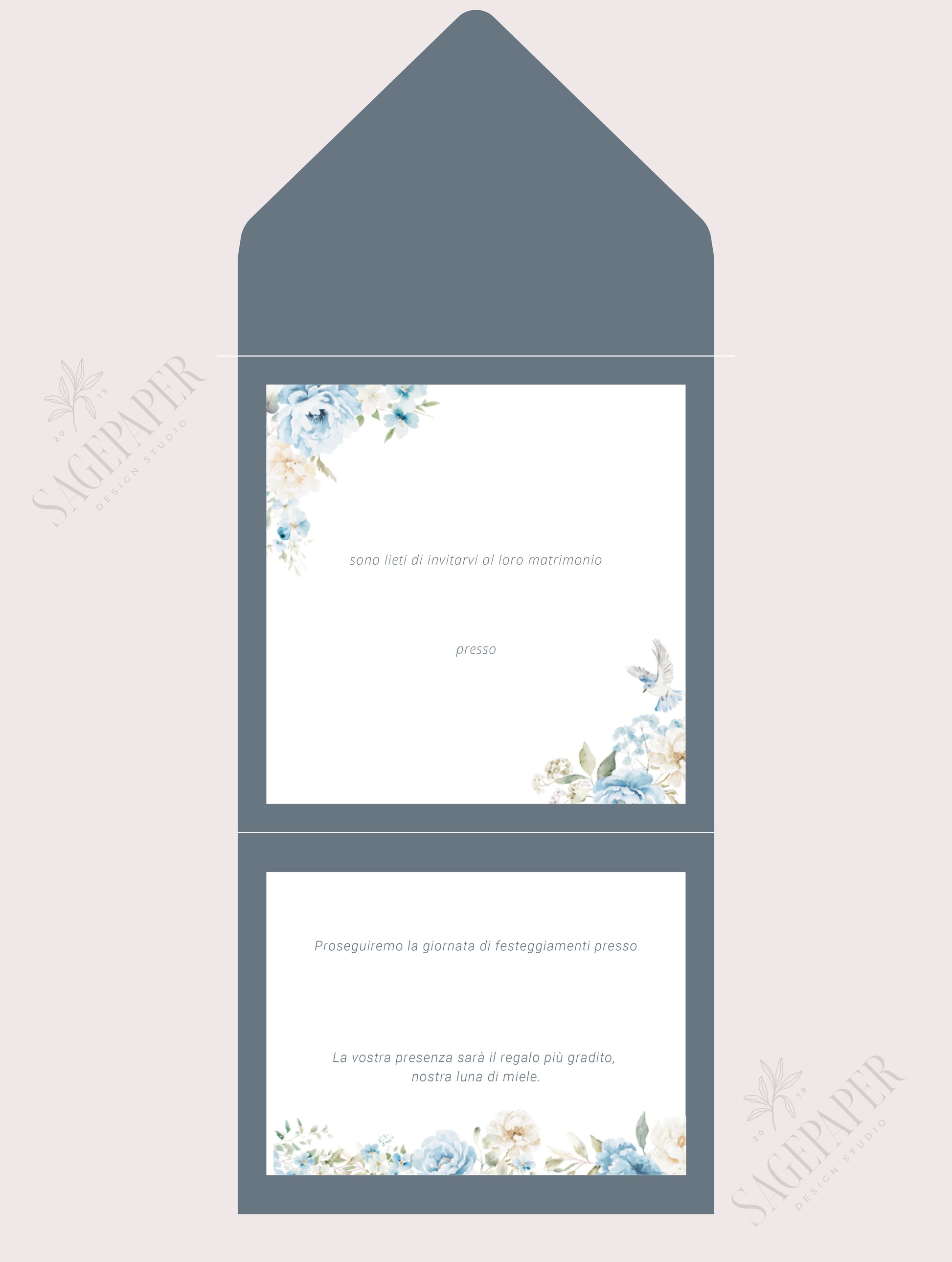 Stampata su cartoncino materico di alta qualità, la suite è composta da tre card — invito, dettagli e lista nozze — raccolte in una tasca coordinata con busta in carta color blu ardesia.