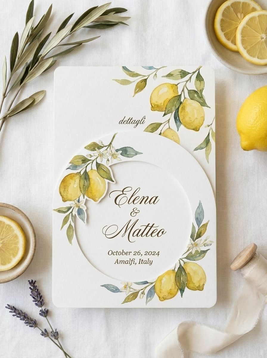 Partecipazione di matrimonio luminosa e raffinata, ispirata ai profumi e ai colori della Costiera Amalfitana. Il design è impreziosito da un’elegante illustrazione botanica con limoni e fiori d’arancio dipinti ad acquerello, simbolo di freschezza, gioia e tradizione mediterranea.