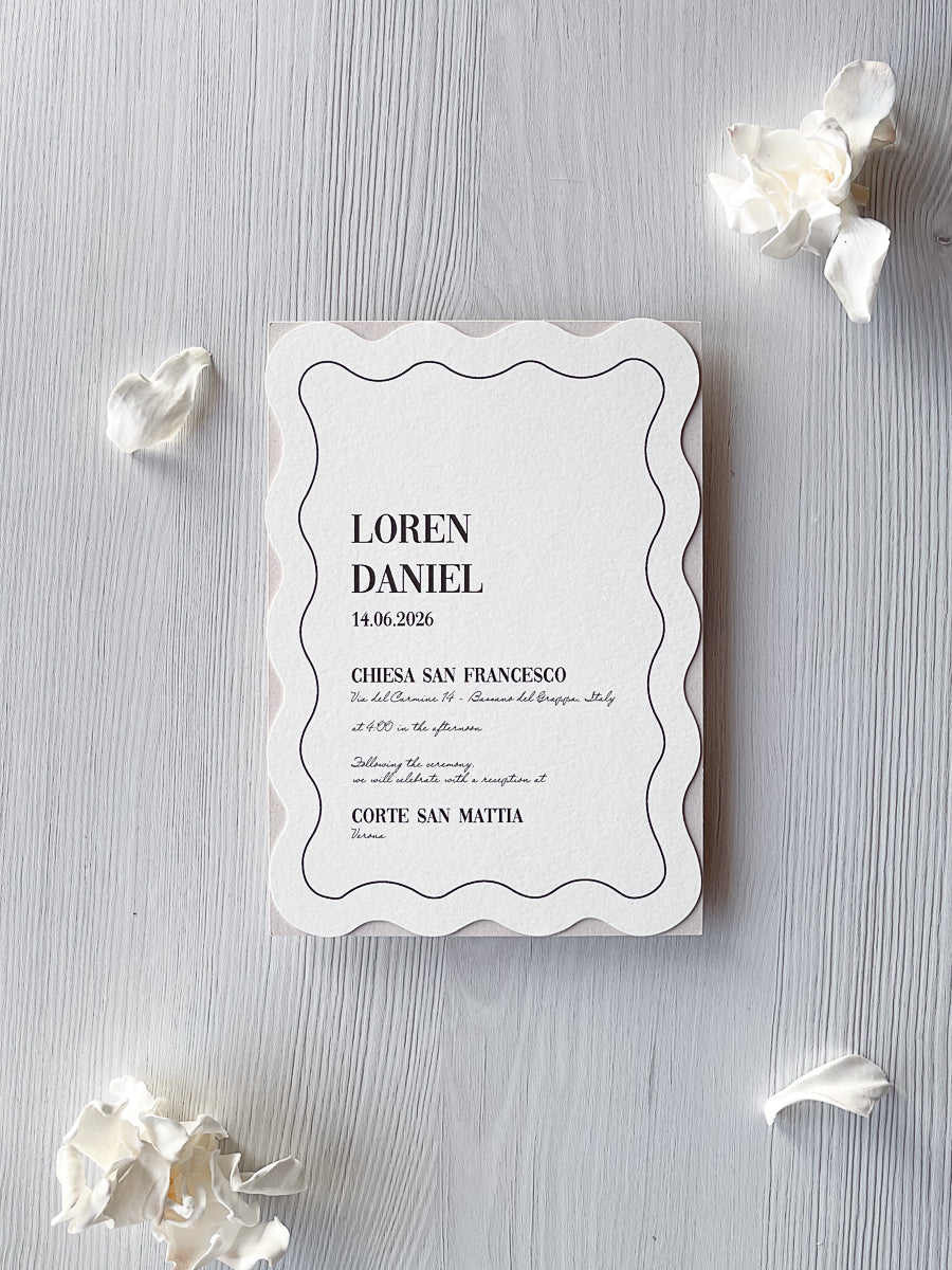 La partecipazione Essential Wave è l’invito ideale per chi ama lo stile contemporaneo e raffinato. Caratterizzata da linee pulite e dettagli essenziali, abbina una tipografia elegante in stile editoriale all’armonia di un design minimalista.