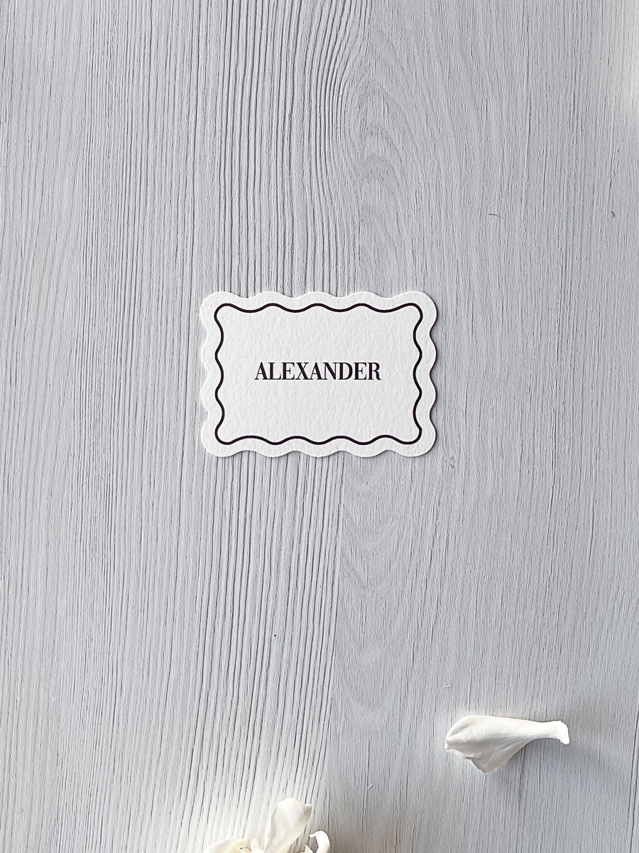 Segnaposto raffinato e originale, realizzato su carta pregiata, sagomato a pergamena arrotolata alle estremità. Il design minimal e la calligrafia elegante lo rendono un dettaglio ricercato per la mise en place, perfetto per matrimoni e cene formali. La sua forma sinuosa dona tridimensionalità al tavolo, trasformando ogni posto a sedere in un’esperienza curata nei minimi dettagli.
