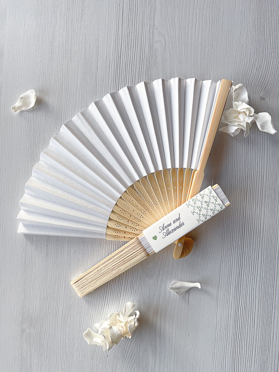 Questo ventaglio matrimonio personalizzato non solo dona freschezza agli invitati durante la giornata, ma diventa anche un ricordo elegante da conservare.