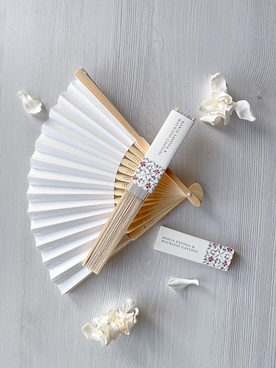 Il ventaglio con cover è un dettaglio raffinato e funzionale, perfetto per matrimoni, cerimonie ed eventi all’aperto. Realizzato in legno e carta resistente, viene abbinato a una cover personalizzabile che riprende lo stile grafico scelto per il tuo coordinato.