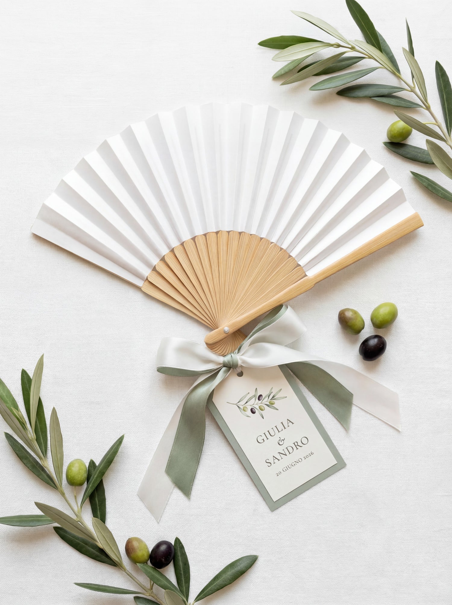 Ventaglio pieghevole in legno naturale con carta bianca, rifinito da un elegante nastro in doppio raso nei toni del verde salvia e avorio. Il cartellino coordinato, personalizzabile con nomi e data, è decorato con un delicato motivo a rami d’ulivo, simbolo di armonia e tradizione mediterranea.